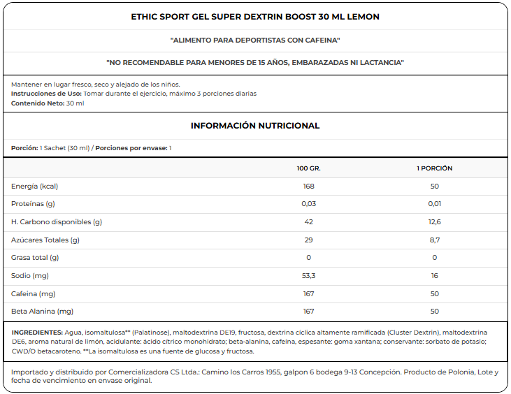 Ethic Sport Gel Super Dextrin BOOST es un producto recomendado para personas deportistas que realizan actividad física de larga duración o intensidad. Además, aporta ciclodextrinas (Cluster Dextrin®), PalatinoseTM y 2 maltodextrinas con diferente equivalencia en dextrosa, con la adición de beta alanina y cafeína.