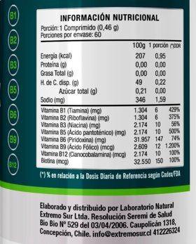 B-complex es una fórmula completa que aporta todas las vitaminas esenciales del complejo B que son fundamentales para nuestro bienestar y salud. Además, cada comprimido aporta una combinación balanceada de vitaminas B1, B2, B3, B5, B6, B7 (biotina), B9 (ácido fólico) y B12, nutrientes claves para la producción de energía.