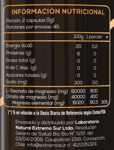 Extremo Sur Magnesio L-Treonato es un suplemento que contiene 600 mg de L-Treonato de magnesio y 400 mg de citrato de magnesio que te proporciona múltiples beneficios especialmente enfocados en el funcionamiento cognitivo y cerebral.