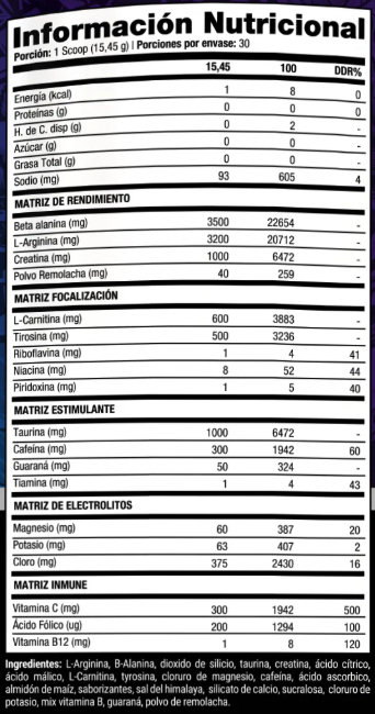 USO SUGERIDO: Mezcle 1 scoop de HYDE Nightmare con 6-8 oz de agua. Consumir 15-30 minutos antes de un entrenamiento intenso o competición. Evalúe la tolerancia tomando ½ cucharada la primera vez. No consumir dentro de las 4 horas antes de acostarse. No tome ningún otro producto con cafeína o estimulantes mientras toma HYDE Nightmare.